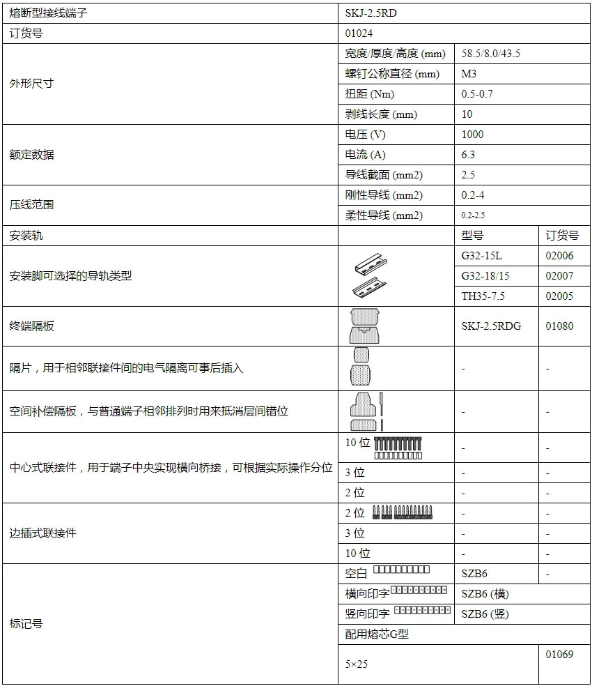 > SKJ-4RD/X,4RD,2.5RD/X,2.5RD為分斷旋臂式保險端子,它的特點是分斷旋臂可向上打開,并固定在終止位置上,分斷旋臂內(nèi)可裝入保險絲,這種端子有帶發(fā)光顯示和不帶發(fā)光顯示兩種型號。