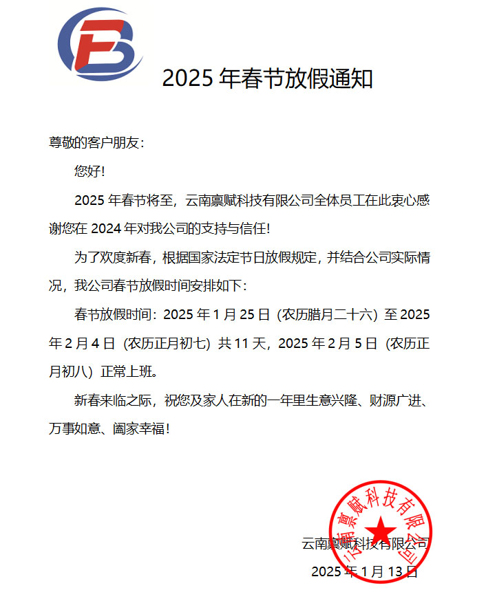 2025年春節將至,云南稟賦科技有限公司全體員工在此衷心感謝您在2024年對我公司的支持與信任!為了歡度新春,根據國家法定節日放假規定,并結合公司實際情況,我公司春節放假時間安排如下: