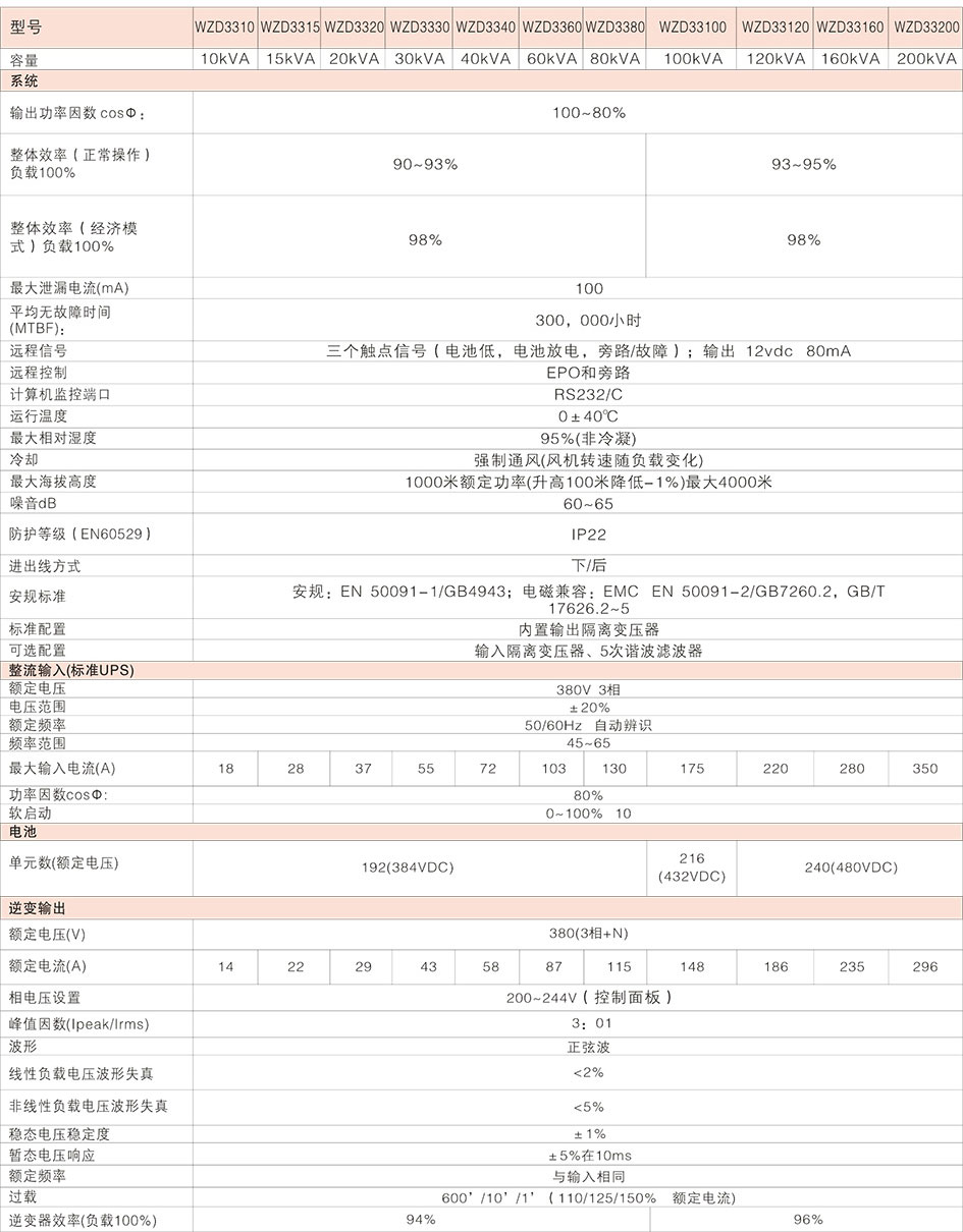 5、WZD9300系列UPS為三進(jìn)單出型(三相輸入、單相輸出)智能工頻在線式不間斷電源系統(tǒng),共有8kVA、10kVA、15kVA、20kVA、30kVA規(guī)格。