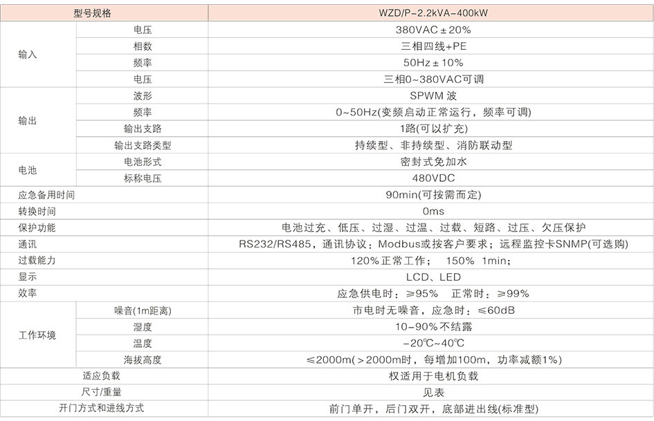 四、WZD-EPS動力變頻應急電源具體規格:2.2、3.7、5.5、7.5、11、15、18.5、22、30、45、55、75、93、110、132、160、187、200、220、250、280、315、400、500kW等。