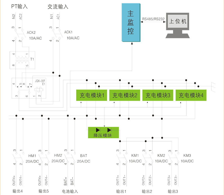5、監控模塊采用LCD漢字菜單顯示,系統監控和電池智能化管理功能完善,具有與自動化系統連接的四遙接口,提供RS232和RS485兩種通訊選擇,提供RTU、CDT、MODBUS三種通訊規約選擇;