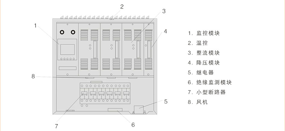 3、系統由整流模塊、監控模塊、降壓模塊、配電單元和電池安裝板構成;