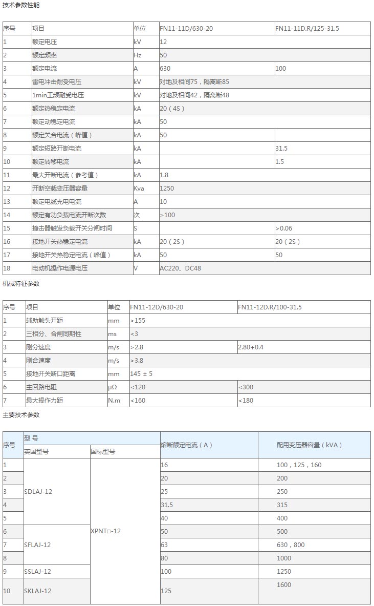 FN11-12D.R/100-31.5型戶內交流高壓負荷開關——熔斷器組合電器(以下簡稱FN11-12D.R組合電器)是FN11-12D負荷開關開斷與S□LAJ-12(XRNT□-12)高壓限流式熔斷器組合在一起的戶內高壓開關設備。它可以可靠開斷直至短路電流的任何電流:負荷開關開斷工作電流,熔斷器開斷短路電流,聯合開斷工作電流與全短路電流之間的任何過電流,同時熔斷器通過其撞擊器使負荷開關分閘。