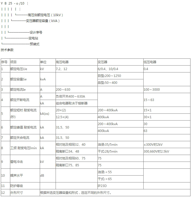 型箱式變電站是一種將中壓開關設備、變壓器、低壓配電設備組裝成一體的成套性產品。它作為城市建筑、生活小區,中小型工廠、礦山油田等用電部門的變配電設備,具有成套性強、體積小結構緊湊、可靠性高、現場安裝工作量小、安裝調試周期短,以及可移等特點。適當改變其外形和顏色,使之與環境相適應,還可以起到美化環境的作用。是目前聲城鄉土建變配電站的替代產品和城網建設、改造的新型成套設備。高壓側一般采用HXGN系列環網柜內配(壓氣式、真空、SF6)負荷開關、熔斷器(有要求可用斷路器)。低壓側采用最新型的塑殼式自動空氣開磁,分斷能力高,保護性能好。變壓器既可采用油浸式變壓器,也可采用干式變壓器。外殼有鋁金合板、鋼板、復合板等多種材料選擇。內襯絕熱材料,頂蓋為雙層,可有效防止熱輻射。箱內設有降溫設施及防凝露設備。